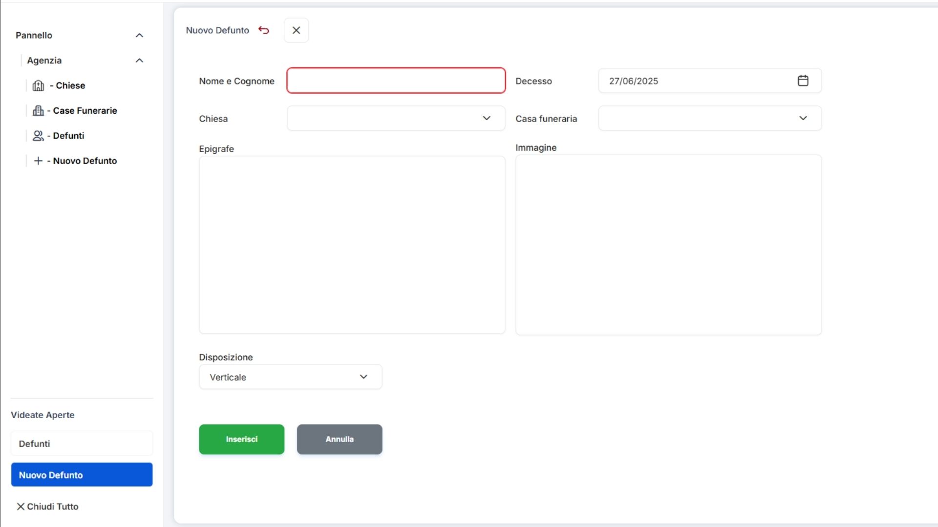 Basta inserire i dati del defunto e l’epigrafe. Il sistema genera automaticamente tutto il necessario.