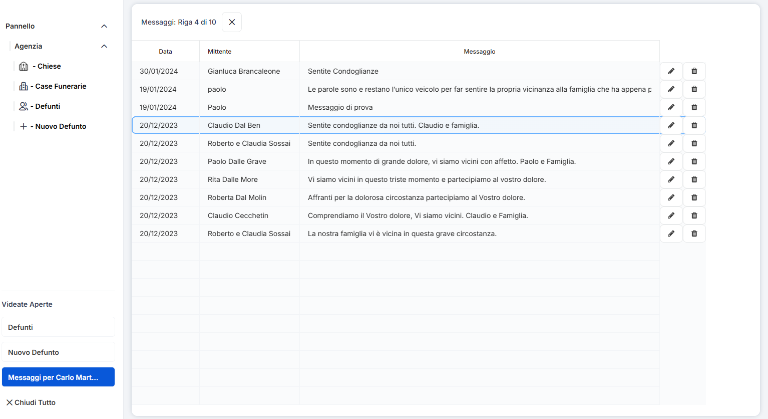 Messaggi con separatori chiari, nomi dei mittenti, date di invio e foto del defunto inclusa.